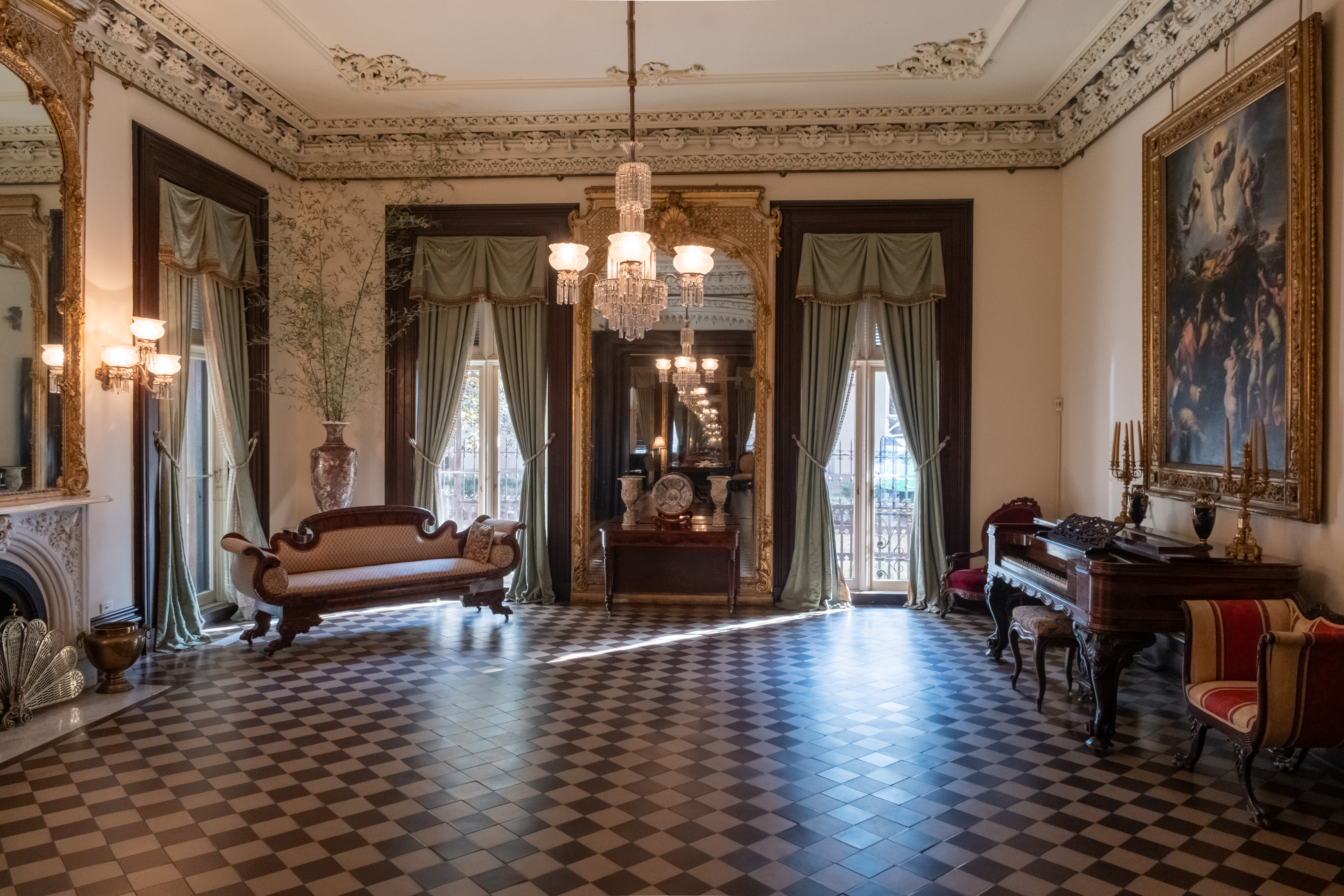 There are marble mantles in each room in the house, the two in the double drawing rooms being of Carrara marble. Other original adornments in these rooms are the matching chandeliers and the large mirrors in gold leaf frames which were brought from Austria.